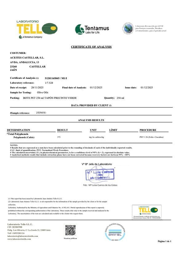 For the 2025/2026 season, Nobleza del Sur “Night” reaches a polyphenol level of 373 mg/kg, delivering impressive antioxidant richness.