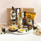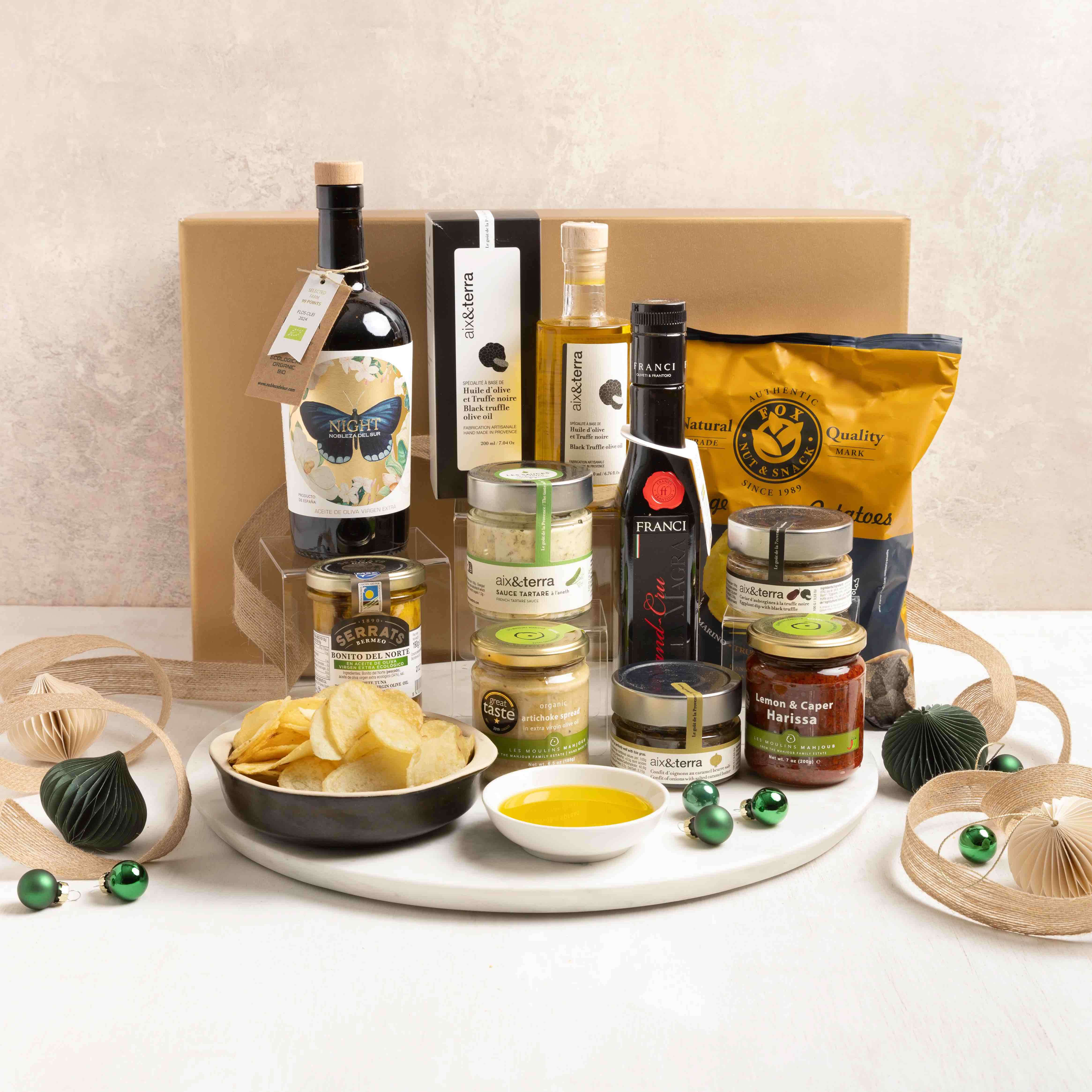 Land & Sea Gourmet Hamper includes a bottle of Nobleza del Sur Limited Edition Organic Night Extra Virgin Olive Oil 500m, a bottle of Franci Villa Magra Grand Cru 250ml, a bottle of aix&terra truffle oil with a piece of black truffle from Périgord 200ml, a jar of Serrats Spanish bonito del Norte tuna in olive oil of 190g, a pack of Fox Truffle crisps of 120g, a jar of aix&terra, aix&terra red bell pepper dip , a jar of aix&terra mustard with summer truffle, a jar of the Moulins Mahjoub organic artichoke spread of 185g, a jar of the Moulins Mahjoub organic lemon and capers harissa of 200g and a large gold hamper box