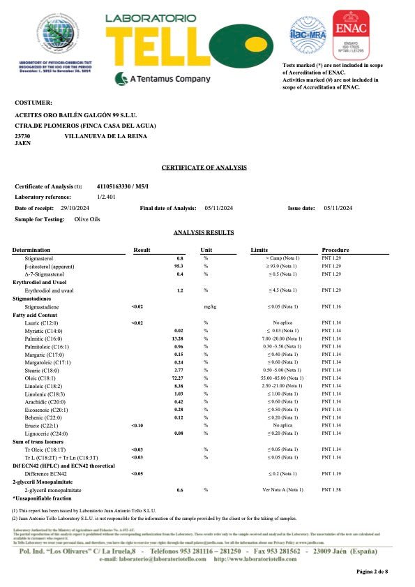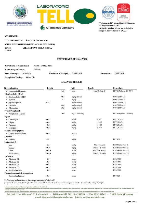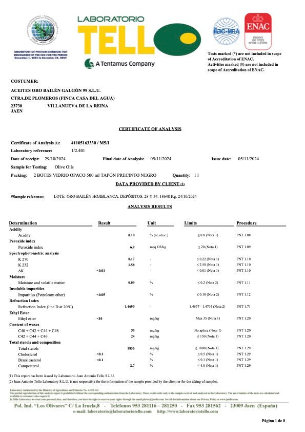 Hojiblanca (2024/2025 new harvest) is the mildest premium olive oil in the range of Oro Bailen, one of the world's most awarded olive oil producers (99 points score in Flos Olei, the international olive oil guide) based in Jaen, Andalusia and run by José Galvez, after taking over the family business. This ultra-low acidity (0.1%) single estate premium extra virgin olive oil is typically produced in October during the first 2 weeks of harvest. It is cold-extracted within 2 hours and filtered to preserve its taste and quality throughout its shelf life. It is a mild fruity and very balanced extra virgin olive oil with aromas of artichokes, tomatoes and apples and hints of fennel and peppermint. Its delicate profile makes it particularly versatile. We recommend it for salads, seafood and fish. The Oro Bailen Hojiblanca extra virgin olive oil has a high polyphenol content of 409 mg/kg.